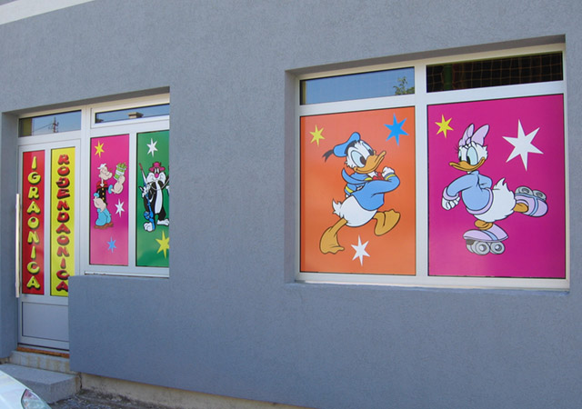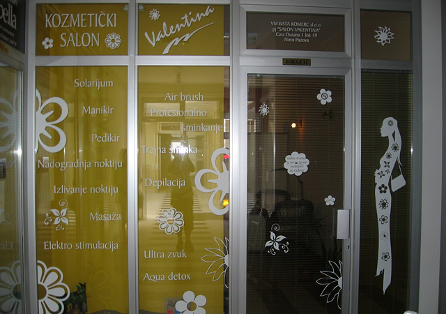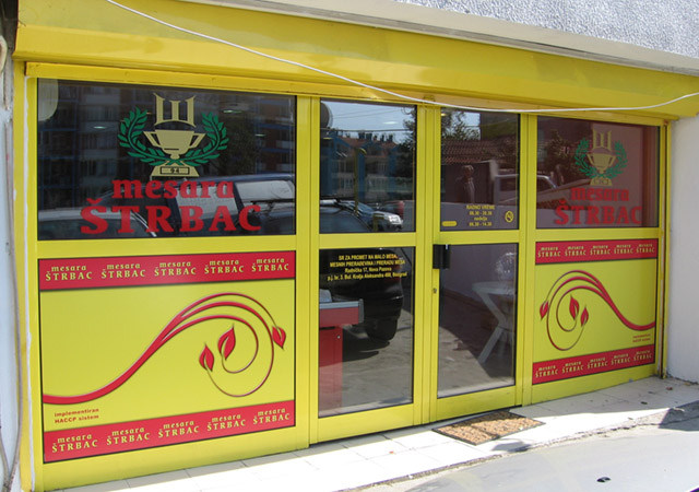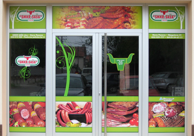 Danas je ovaj vid reklame gotovo neizbežan. Zna se da je zakonom obavezno isticanje firme i radnog vremena kao i još nekih detalja, tako da se grafikom na vratima i izlogu to najjevtinije rešava. Apliciranjem stakla na Vašem izlogu moguće je postići niz efekata. Prvo dobru uočljivost vaših proizvoda i usluga, zatim sprečavanje direktnog uticaja sunčevih zraka (ako je to potrebno), dobijanje intimnijeg, prijatnijeg poslovnog prostora na mestima gde su velike staklene površine itd. Na mestima gde su mali izlozi, obično se koristi katovana PVC folija, tako da je poruka preneta, a još uvek je moguće videti izložene proizvode. Kada je potrebno obezbediti diskreciju u lokalu a vidljivost ka spolja, tada koristimo perforiranu plotovanu PVC foliju. Sa specijalnim folijama koje imaju efekat peskiranog stakla, moguće je zatvarati cele površine ili u kombinaciji sa drugim raznim folijama dobiti veoma zanimljive forme.